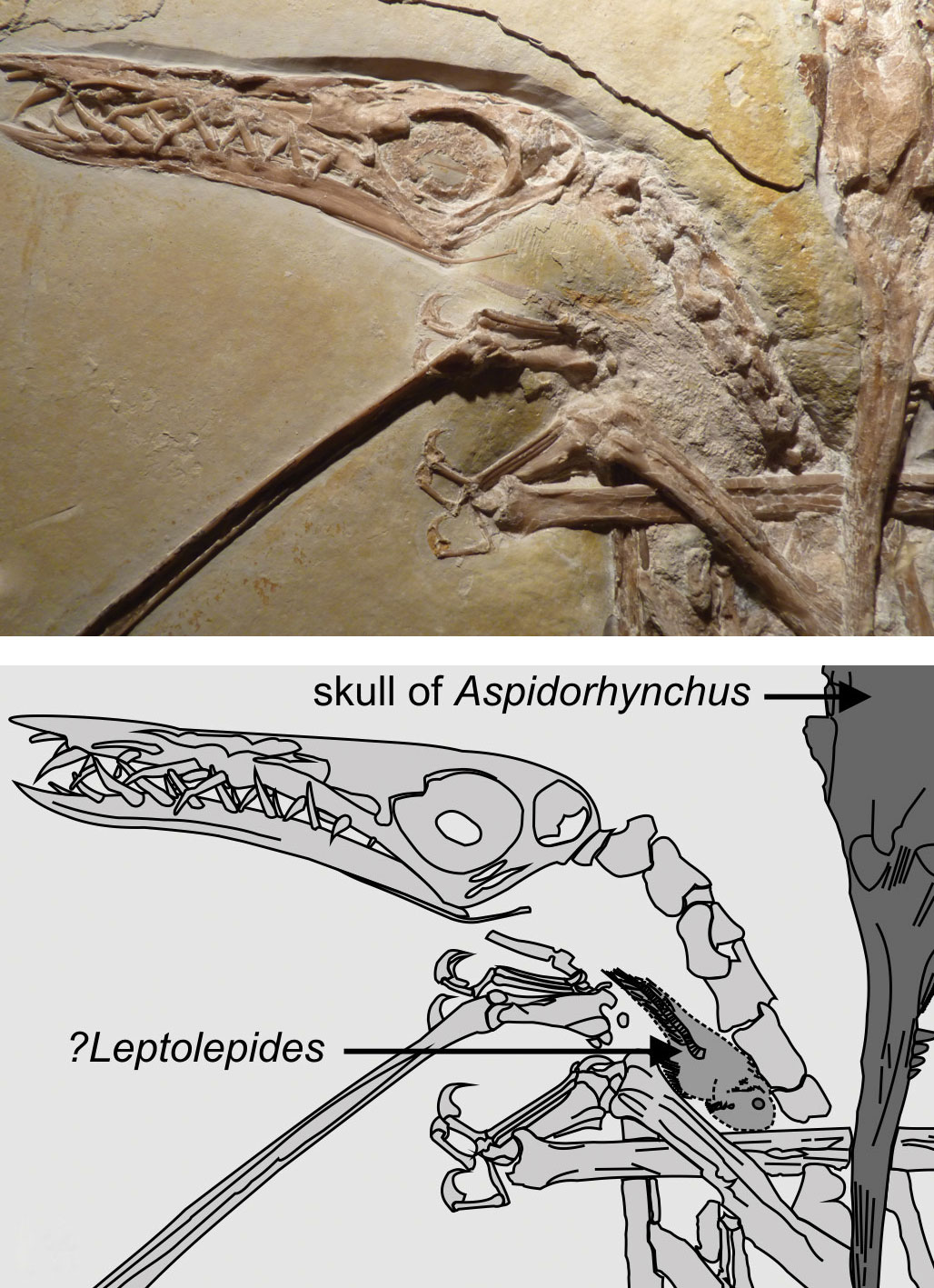 Um extremamente raro e bem preservado fóssil encontrado no famoso depósito de calcário Solnhofen, na Alemanha, entrelaçou eternamente as vidas de três animais. O fóssil registra os momentos subsequentes em que um pterossauro [dinossauro voador] de cauda longa, Rhamphorhynchus, mergulhou e pegou um peixe pequeno, que pensa-se ser o Leptolepides, quando um peixe predador maior, Aspidorhynchus, conseguiu saltar e se agarrar à membrana de vôo da asa do pterossauro, puxando-o de volta para a água.